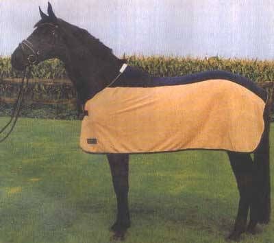 Topaktuelles Modell in hochmodischer Aufmachung! Durch die goldenen Litze wirkt die Decke besonders elegant. Das Oberamterial transportiert die Feuchtigkeit schnell nach aussen! Ihr Pferd wird sehr schnell trocken. Die ideale Abschwitzdecke . Vorne mit Metallverschluss. Maschienenwaschbar bei 30° Grad. Trocknergeeignet.