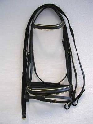 Trense in bester Importqualität. Mit englisch kombiniertem Reithalfter. Stirn- und Nasenriemen sind mit einer Goldbiese verziert! Trense wird mit Gurtzügeln ausgeliefert!